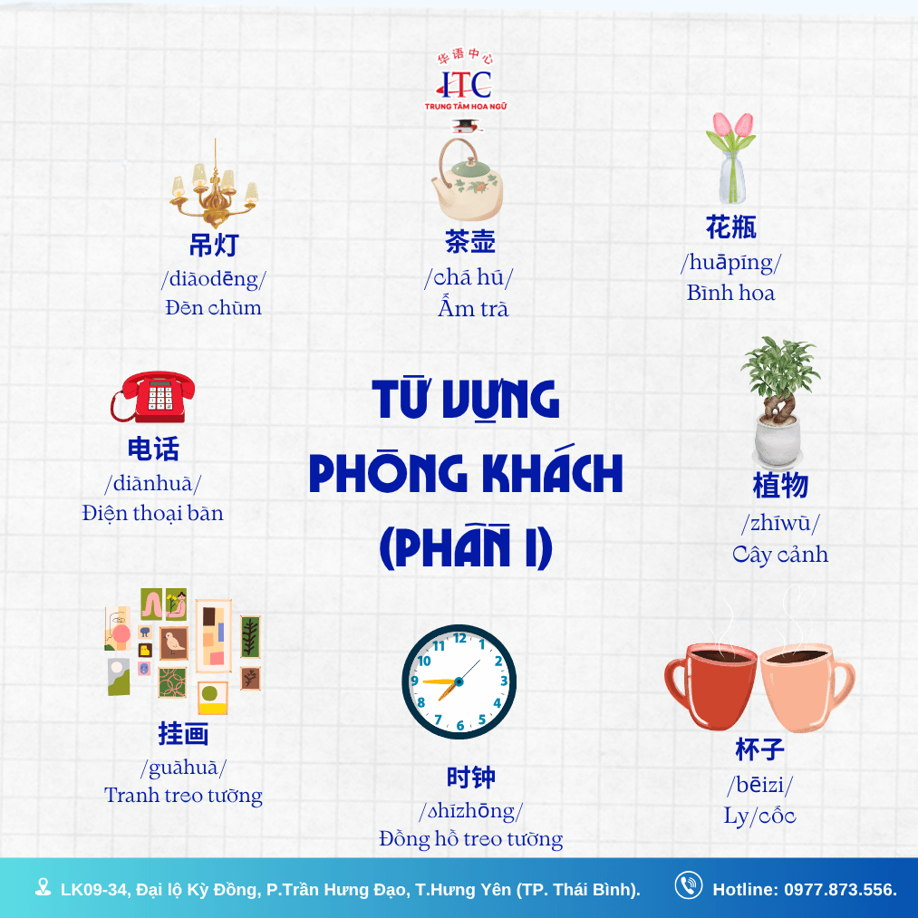 Hôm nay, Trung tâm Hoa Ngữ ITC sẽ cùng bạn khám phá từ vựng tiếng Trung chủ đề “Phòng khách” – Phần 1, qua những vật dụng quen thuộc trong ngôi nhà của chúng ta nhé! 🌸